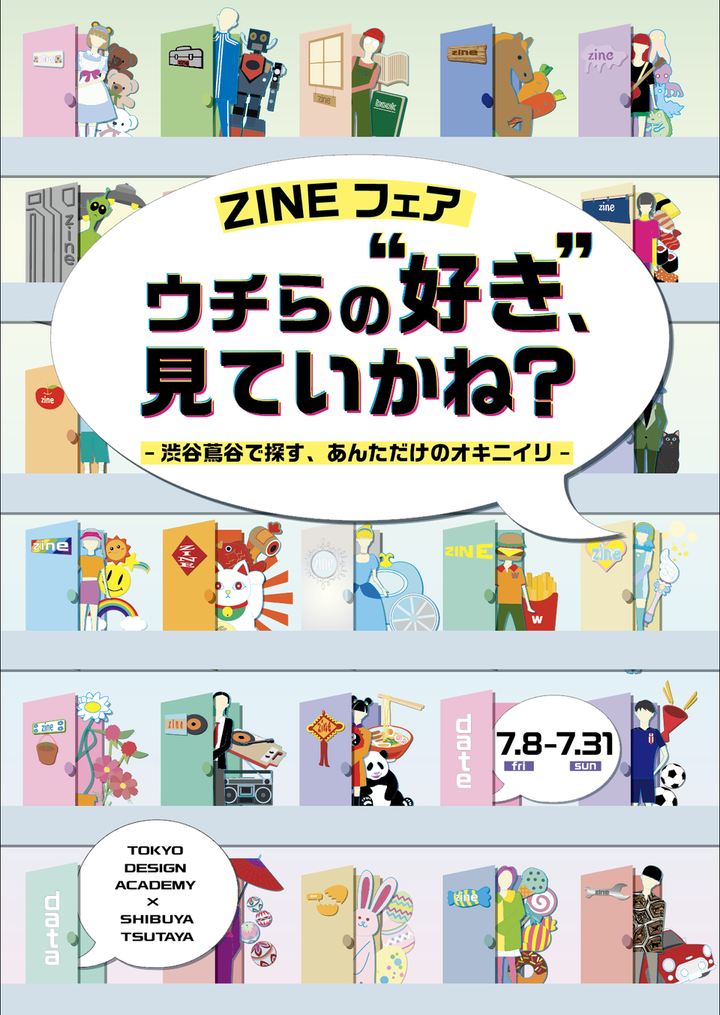 東京デザイン専門学校の学生が渋谷TSUTAYAでZINE を販売するという企画の、企画内容とメインビジュアルを制作しました。 zineフェアというのは集合住宅のようだと感じたので、マンションの扉からみんなが「ウチらの好き見ていかね?」と呼び込んでいるようなビジュアルを制作しました。 部屋をzineとし、各々の好きなものが飛び出ている楽しげなイラストを描きました。