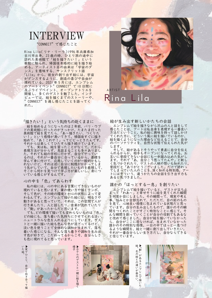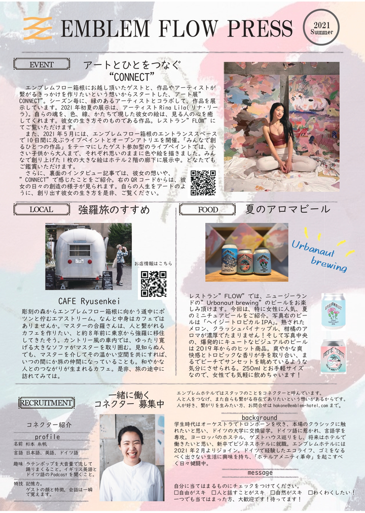 ホテル宿泊者向けの紙のニュースレター。 ホテル館内のイベントやイベントにまつわるアーティストさんのインタビュー記事、ホテル周辺のおすすめ観光情報などをお伝えしています。