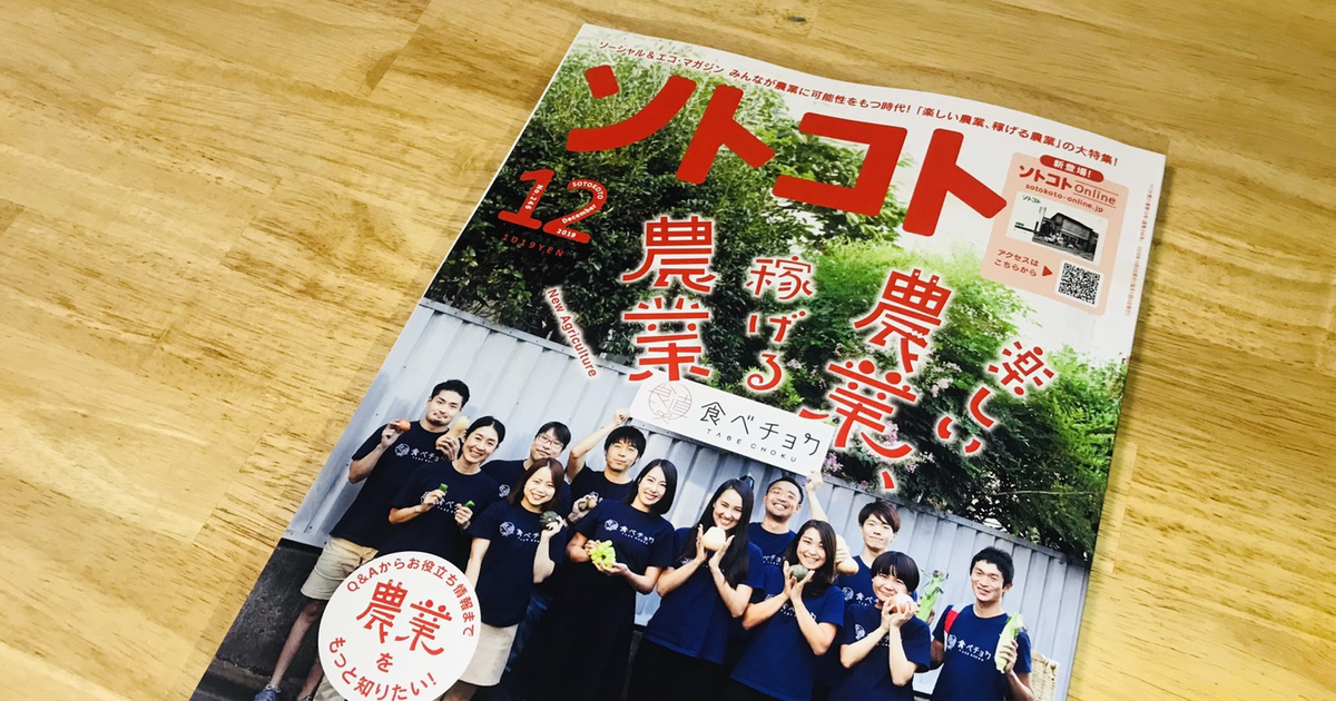 こんばんは、食べチョク広報の下村です!本日(2019年11月5日)発売のソーシャル&エコマガジン「ソトコト」に食べチョク特集が掲載されました。なんと、表紙にも採用していただいています。どんな特集...