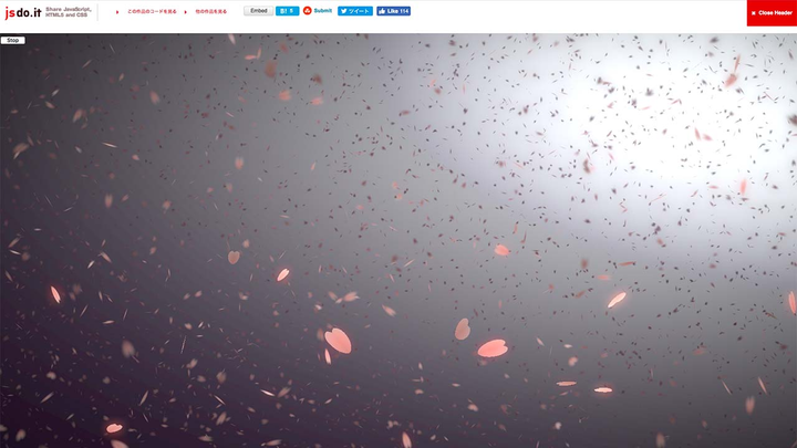 挙げられたFlashで作られた作品をリメイクするというテーマで、サクラの花びらが舞うデモをWebGLでリメイクしたものです。