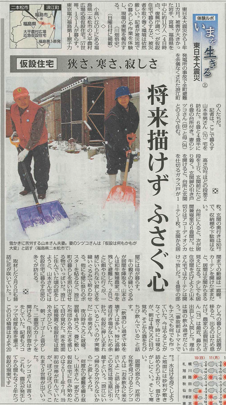 東日本大震災から2年を迎える被災地での現状を自ら体験し、課題を提起した記事です。 仮設住宅の暮らし、被災農地のがれき拾い、放射能に汚染されたシイタケ原木の廃棄作業の3つの事例で、取材しました。