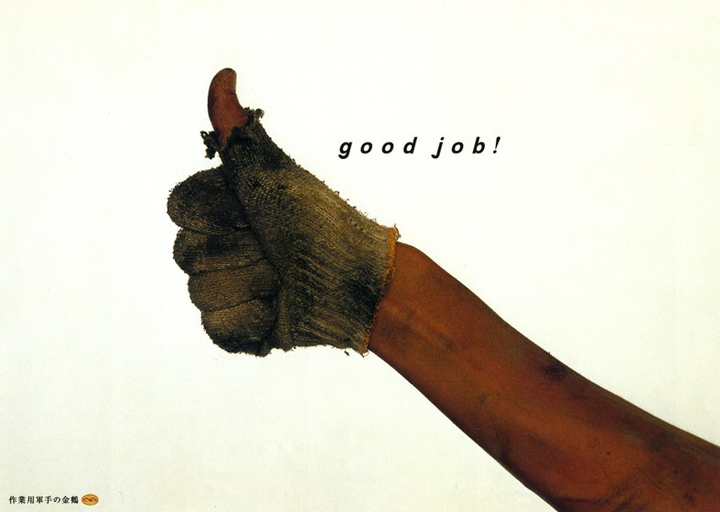 前年に広告キャンペーンの展開を始めた、作業用軍手「金鶴」の第2弾。 訴求対象となるブルーワーカーに対して、その仕事を称える「good job!」を企画コンセプトに、前年同様「金鶴」の顧客の現場から、1日の作業を終えて使い捨てられたプロダクトをいただき、ビジュアルモチーフに据えました。 偶然にも親指がもげた軍手が見つかり、「good job!」の象徴として採用し、「尊い労働」を賛美するVIを制作しました。