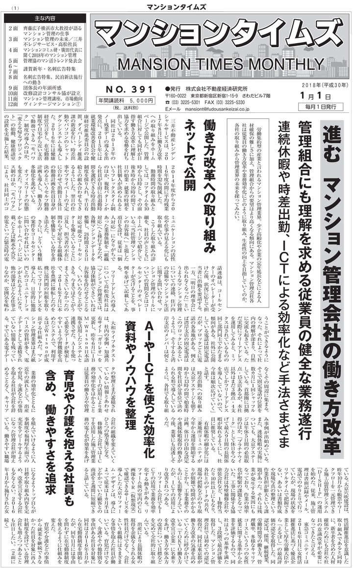 瀬川 真子マンションタイムズ2018年1月号マンション管理会社およびマンション大規模修繕施工会社向けの業界紙。1面の特集記事としてマンション管理会社の働き方改革への取り組みを紹介し、それらの取り組みの方向性について分析した。