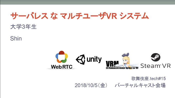 歌舞伎座.tech#15のLT枠で発表した作品。 UnityとWebRTCで超低遅延マルチユーザオンラインVRシステムのモデル開発を行った。