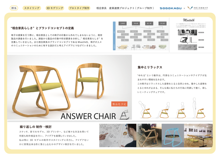 【コントラクト椅子の提案】株式会社相合家具との連携プロジェクトにて「モールドウレタンを用いたコントラクト椅子」をテーマに、椅子の提案・スタイリングを行ったものです。本プロジェクトでは副リーダーを務めました。ANSEWR CHAIRはリラックスした姿勢をとると自然と揺れ、集中した姿勢をとると揺れが止まる、そんな風に私たちの行為に同調して動く、新しいミーティングチェアです。