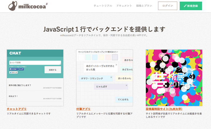 落合 渉悟milkcocoa - Javascript 1行に詰め込まれたバックエンドバックエンドを抽象化してフロントエンジニアが楽にnodeバックエンドを構築できる感じにしてます。mlkcca.com でさらに詳しく