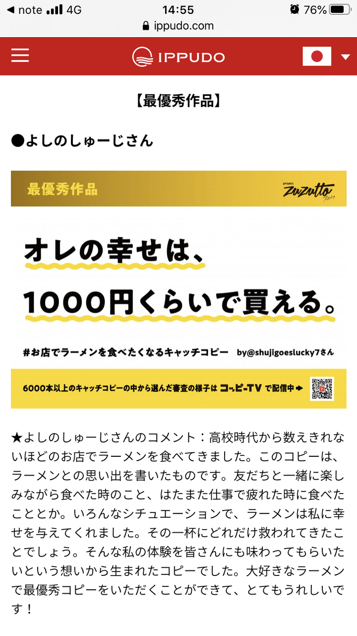 博多発祥のラーメン専門店「一風堂」がTwitterで募集していた「#お店でラーメンを食べたくなるコピー」で、応募数6000を超える中から最優秀コピー作品を受賞しました。
