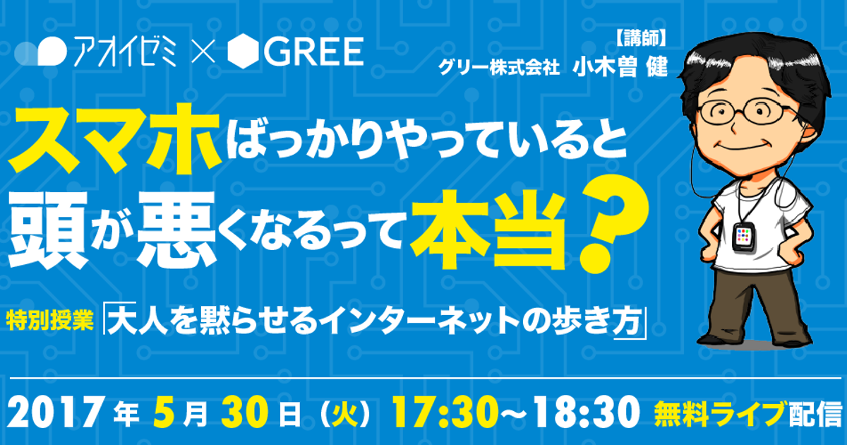30万人の中高生が利用するスマホ学習塾「アオイゼミ」は、大手インターネット企業のグリーと共同で、2017年5月30日(火)17:30〜18:30に、「情報モラル」特別授業を中高生及び保護者向け...