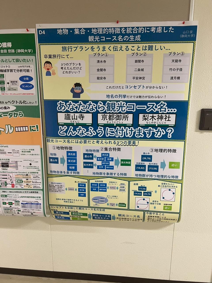 東海関西データベースワークショップ2025(DBWS2025)ポスター発表 (開催日:2025年9月11日〜12日) 2025年9月に開催された「東海関西データベースワークショップ2025(DBWS2025)」にて、「地物・集合・地理的特徴を統合的に考慮した観光コース名の生成」というテーマでポスター発表を行いました。 本イベントは東海圏および関西圏の大学・研究機関の研究者が集まり、データベースや情報アクセス技術、Web情報学などの分野に関して活発な議論と交流を行う研究会です。 私にとってこの発表は、初めて自分の研究を研究室外に発表する機会でした。 発表を通じて他大学の教授や研究生の方々から多くのご意見やアドバイスをいただき、研究の新たな方向性や改善点に気づくことができました。 また、同世代の研究者との交流を通じて、自分の研究テーマを客観的に見つめ直す良い機会にもなりました。 この経験を通して、より多くの人に伝わる形で成果を発信していきたいという意欲が強まりました。学外の視点に触れ、自分の研究を磨くことの重要性を実感できた、非常に刺激的な体験でした。