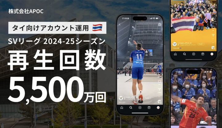 日本企業の海外進出支援およびインバウンド集客支援を行う株式会社APOC(本社:東京都板橋区、代表取締役:齋藤峻輔)は、国内バレーボールリーグ「大同生命SV.LEAGUE(以下、「SVリーグ」)」を運営する一般社団法人SVリーグからタイ向け公式SNSアカウントの運用業務を1シーズンにわたり受託し、2024-25シーズン中において累計5,500万回再生を達成したことをお知らせいたします。