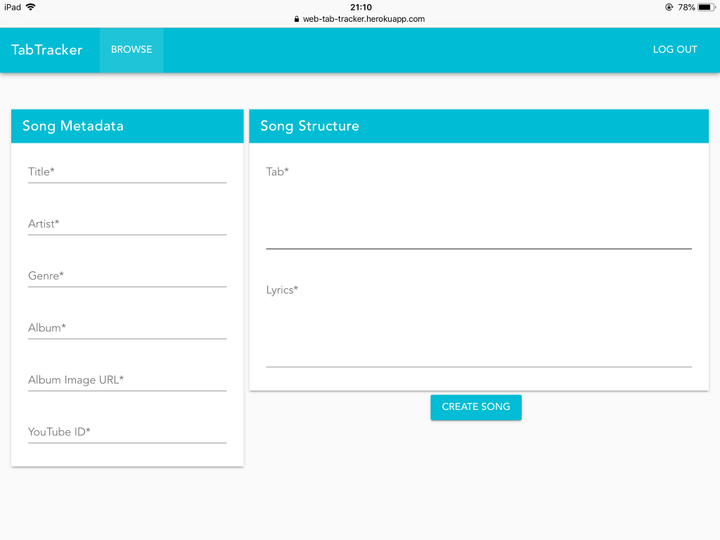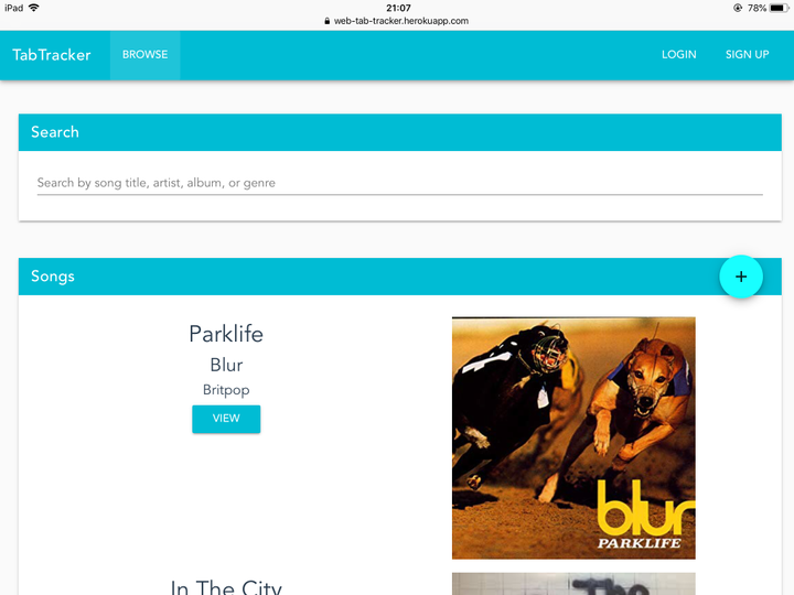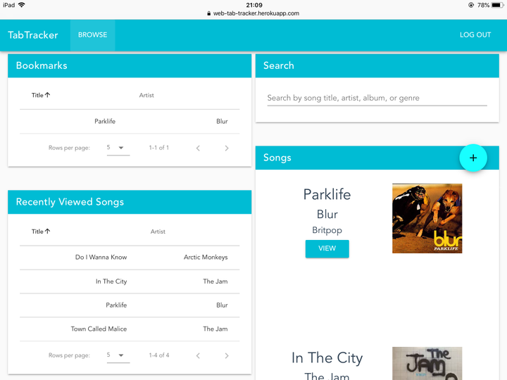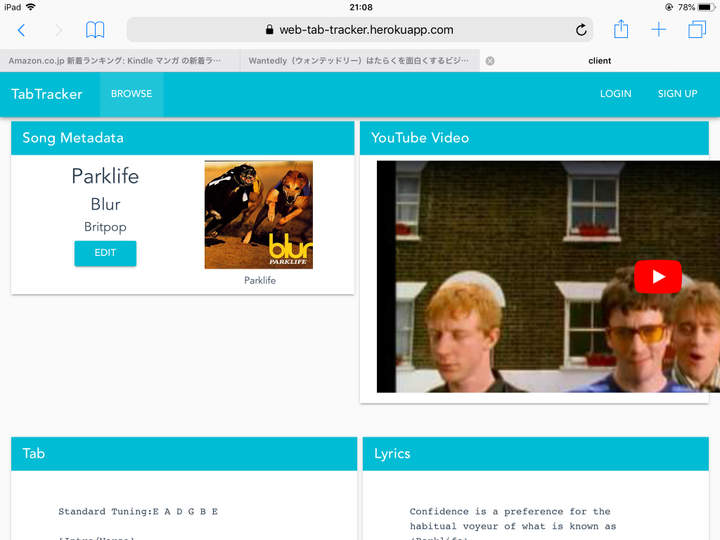 音楽のギターTABと歌詞とYouTubeの動画を表示するNode.jsとVue.jsを使用して作成したシングルページのWebアプリケーションです。 ログインすることで閲覧した音楽の履歴を見ることが出来、また気に入った音楽をブックマークすることが出来ます。 https://web-tab-tracker.herokuapp.com/#/songs heroku上に公開したアプリケーションです。
