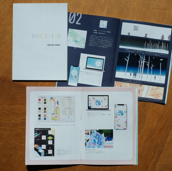 今までの課題設計、コンペ、学園祭のパンフレットデザインをまとめたポートフォリオ。製本方法は糸かがり綴じを行った。