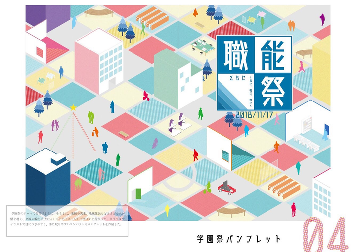 学園祭パンフレットデザインを行なった。学園祭のテーマ「ともに」をもとに様々な人が壁を超え交流の輪を広げていくことをイメージした。
