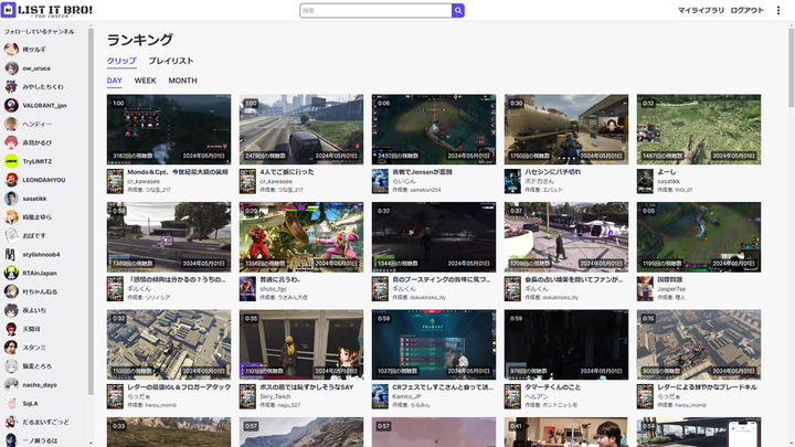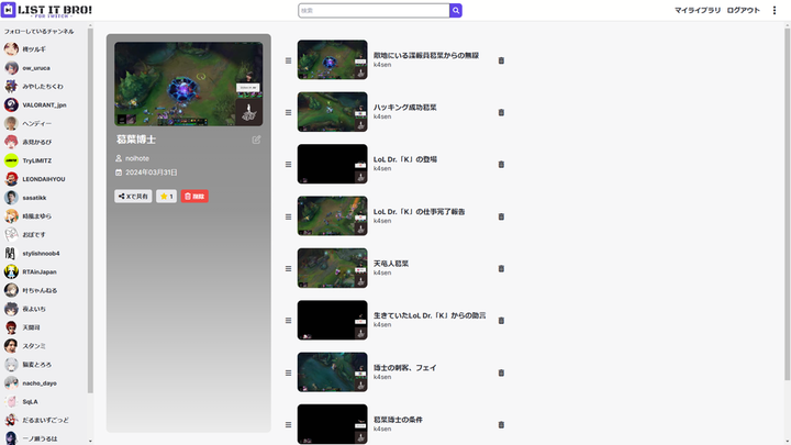 〇サービス概要 List It Bro!はTwitchクリップの検索性の悪さ・共有のしにくさを改善するために開発した、Twitchクリップのプレイリストを作成・管理するWebアプリです。
