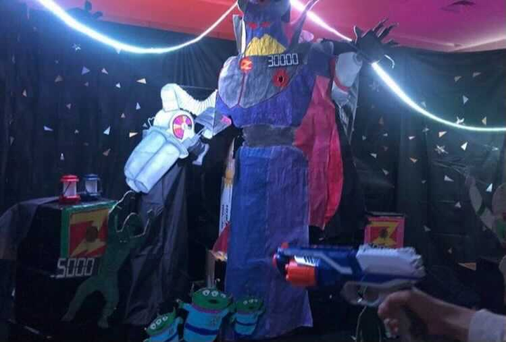 ディズニーを文化祭で体験出来たら最高だと思い、トイストーリーマニアをやりました。 専用のレールとトロッコを作り、銃で敵を倒す(予め設定しておいた的に入れる)というアトラクションにしました。 ただ、画像を見てもわかる通り、バズライトイヤーとごっちゃになっちゃいました笑