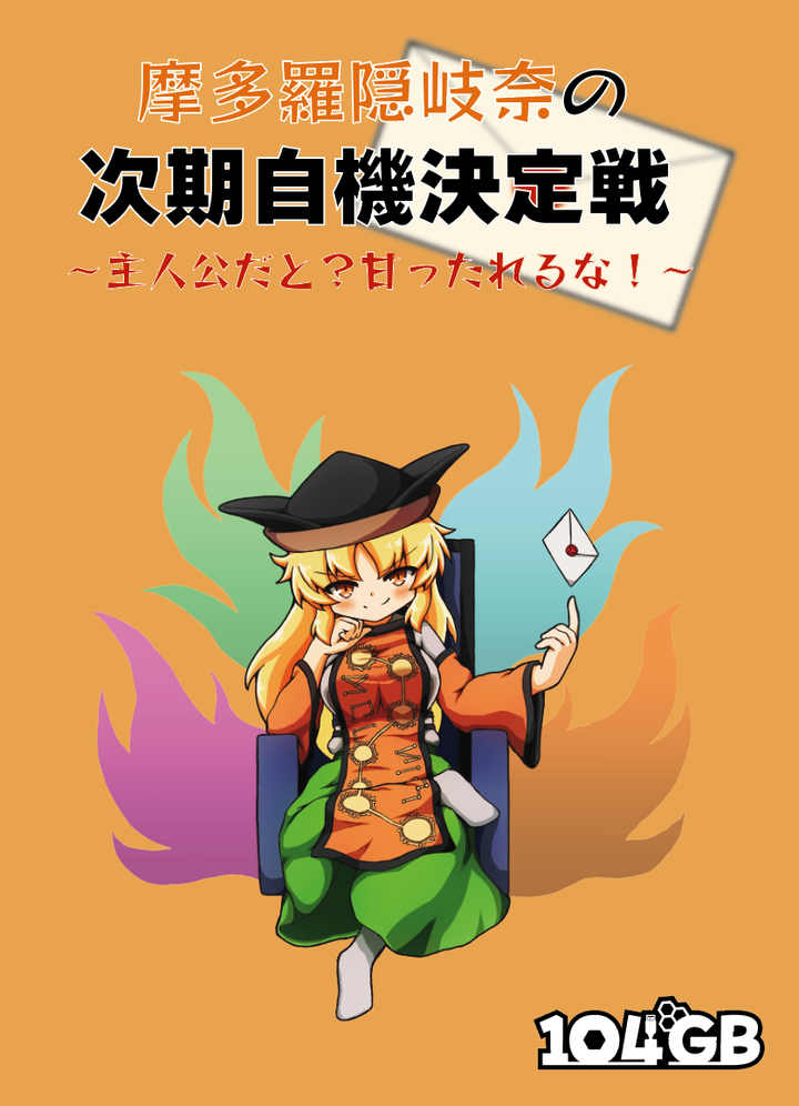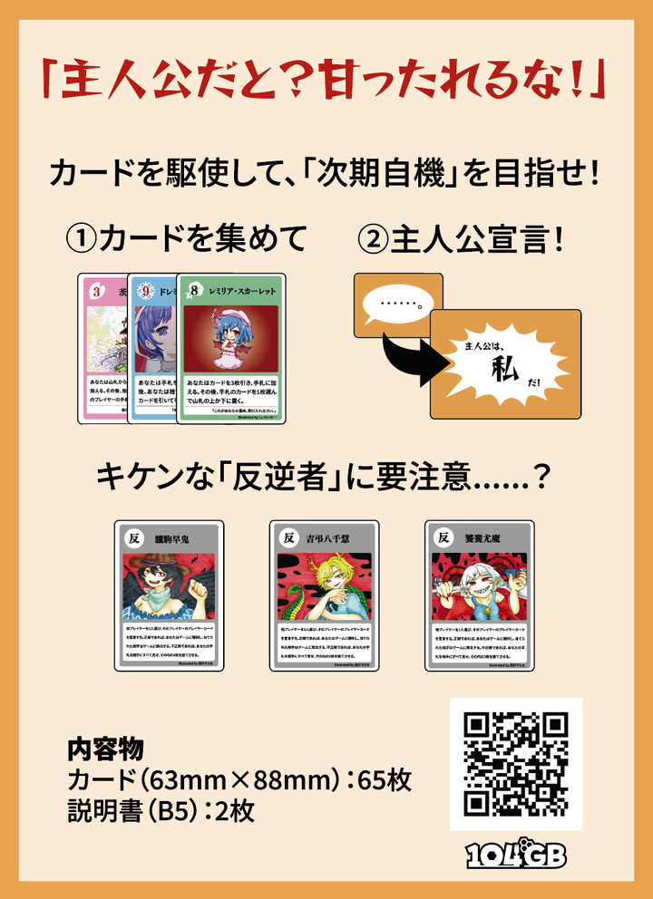 104GB制作の東方Project二次創作ボードゲーム1作目。 カード効果を駆使して、プレイヤーごとに異なる勝利条件を満たすカードを手札に集めていく。また、他プレイヤーの勝利条件を当てることでも勝利が可能。 2023/10/07(日)の「第19回 東方紅楼夢」にて初頒布。
