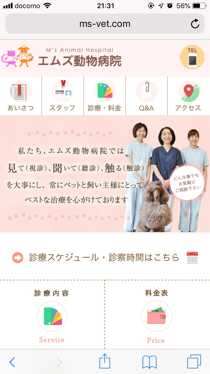PC/MB 両方対応。 女性獣医師の動物病院のコーポレートサイトです。 院長先生の、女性ならではの柔らかさや暖かさ、アットホームな感じを感じてもらえるサイトにしました。 院内撮影、人物撮影も行ない、トータルで制作させていただいております。