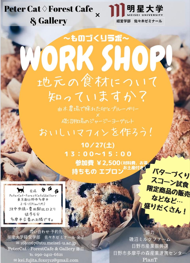 ゼミナールで作成。東京都日野市に位置し、地域交流拠点であるPeterCat Forest cafe とマフィン作りのワークショップ開催した際の広報ポスター。