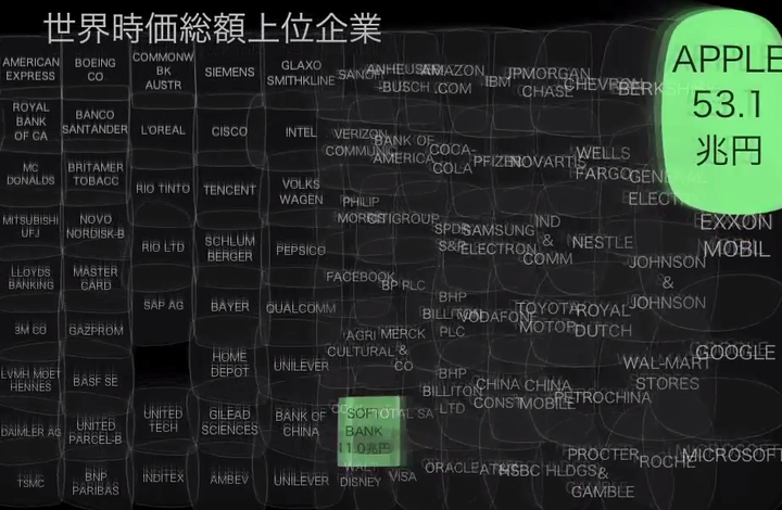 Processingを用いて日本TOP50社の衰退を中心に動的に表現。1年毎や1月毎の表示も可能。