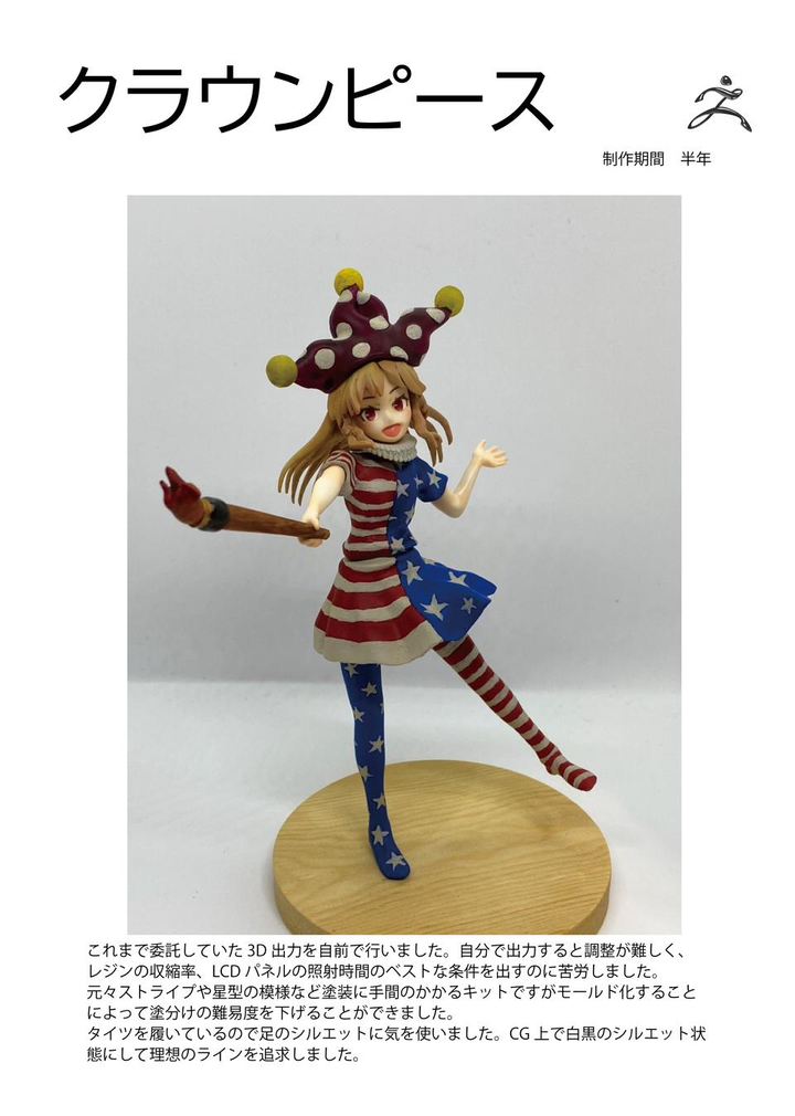 2022年10月東方紅楼夢にて頒布を行ったクラウンピースのガレージキットです。 原型データをzbrushで制作、3dプリンターで出力ののち、シリコンとレジンで複製しました。