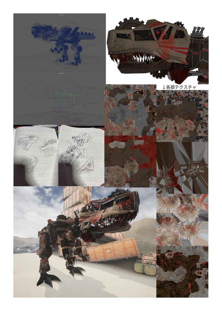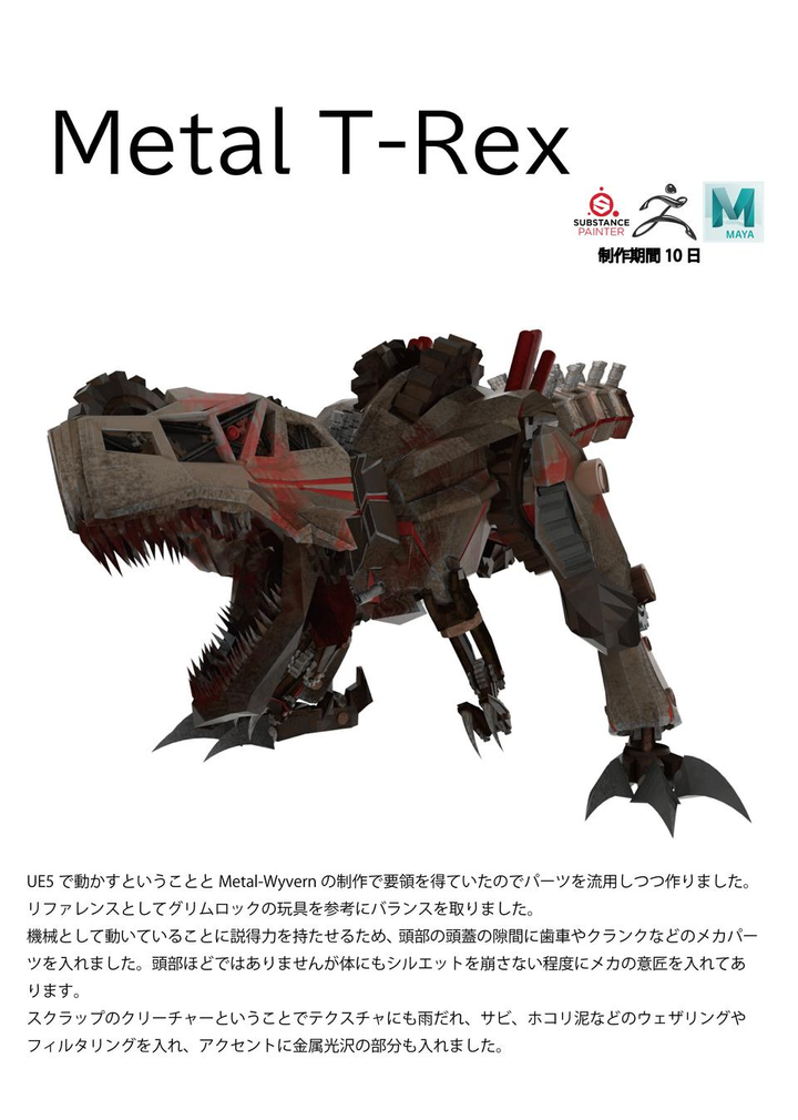 UE5で動かすということとMetal-Wyvernの制作で要領を得ていたのでパーツを流用しつつ作りました。リファレンスとしてグリムロックの玩具を参考にバランスを取りました。 機械として動いていることに説得力を持たせるため、頭部の頭蓋の隙間に歯車やクランクなどのメカパーツを入れました。頭部ほどではありませんが体にもシルエットを崩さない程度にメカの意匠を入れてあります。 スクラップのクリーチャーということでテクスチャにも雨だれ、サビ、ホコリ泥などのウェザリングやフィルタリングを入れ、アクセントに金属光沢の部分も入れました。