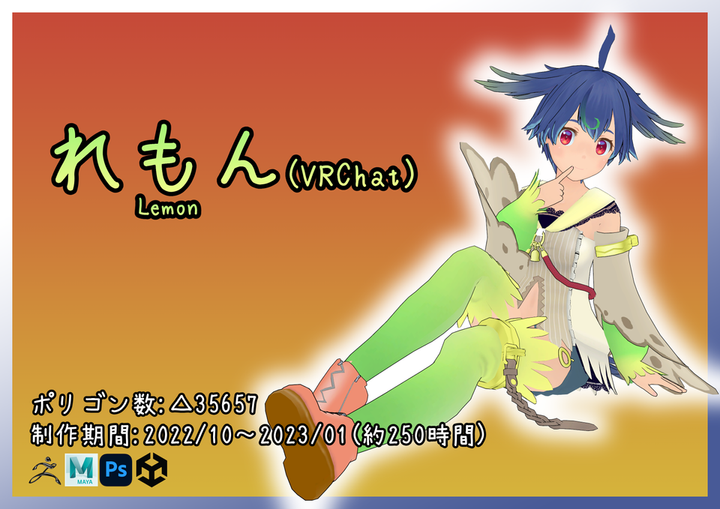 Boothにて販売されているVRChat向けモデル『れもん』を真似て制作しました。 3Dキャラクターのトポロジーやスキニングなどの一連の流れをよく知るために行い、しっかりと流れを掴むことができたと感じています。