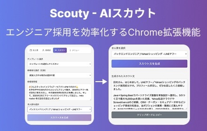 AIが候補者をマッチング分析し、30秒で最適なスカウト文を生成。LinkedIn・Wantedly・GitHub対応。返信率3倍、アプローチ数5倍を実現 人事担当者と経営者のための究極のエンジニア採用支援ツールです。候補者のプロフィールを読み取り、あなたの求人票に最適化されたパーソナライズされたスカウト文を瞬時に生成します。