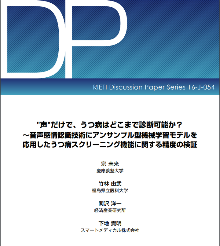 経済産業研究所での共同研究論文。音声感情解析技術がうつ病の診断に活用できるかを検証した。