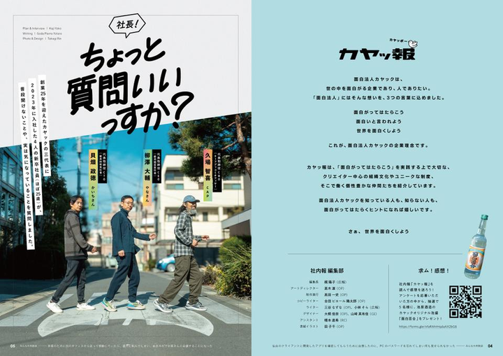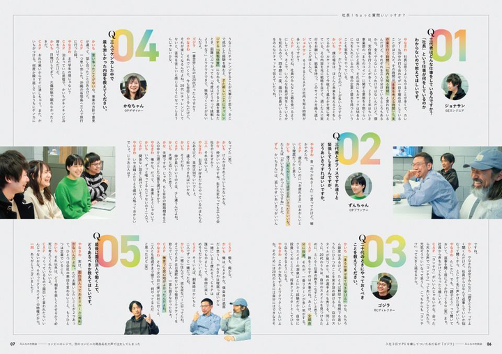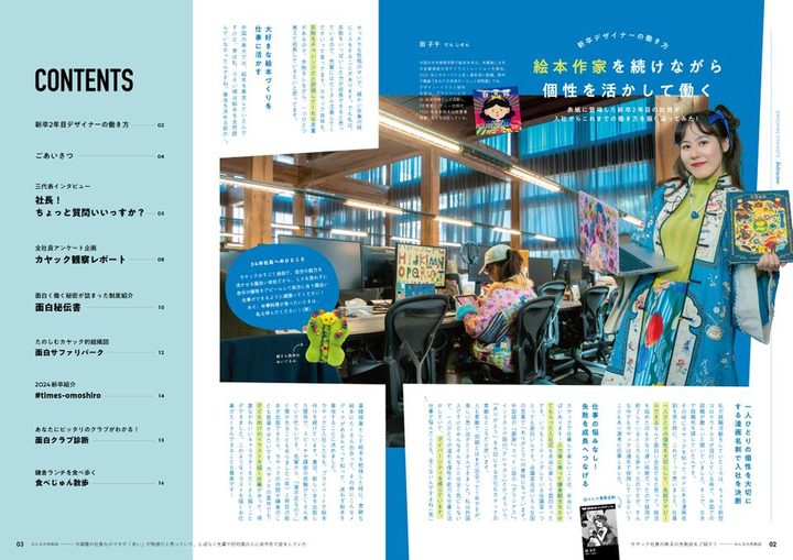 会社の公式社内報を作りました。去年の自主的な活動が認められ、今年は広報部と連携して公式の動きになりました。アートディレクターとして16ページ全体をディレクション。2年目の先輩として2人の新卒教育にもチャレンジしました。今後長く続くプロジェクトになるよう、土台を作ることができました。