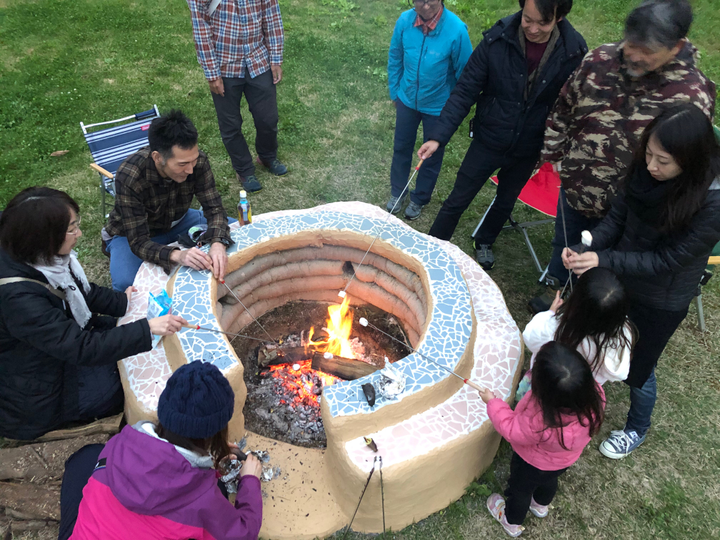 国営公園内に、土が主材のアースバッグ工法を用いて施工した焚き火台作品。