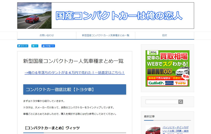 国産コンパクトカーに特化したサイトです。 各車種についてや車種の比較記事など。 訴求ポイントは、一括査定のアフィリエイト案件。 「マーチ 後部座席」 「クロスビー ソリオ どっち」 「ヴィッツ 運転席」 など多数の2語KWで1位を保っています。 2018年9月を最後に更新をやめましたが、 放置で今現在でも7000PV/月はあります。 記事を入れていた2018年頃は27000PV/月 はありました。