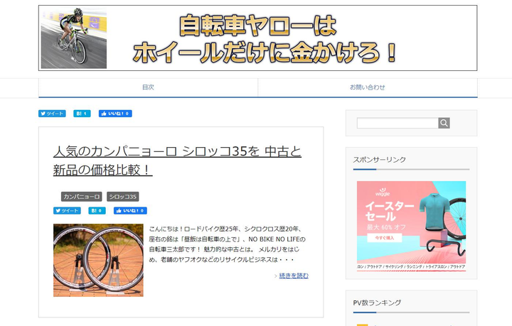 ロードバイクのホイールのレビューサイトです。 ロードバイクが趣味だったので、それを生かして作成したサイトです。 ロードバイク乗りはホイールにお金を数万~数十万円以上かけるので ホイールに特化したサイトを作成しました。 訴求ポイントは、イギリスのECサイトwiggleでの購入からのアフィリエイトになります。 マニアックなKWですが 「bora ultra 80 インプレ」1位 「カンパ バレット 50 インプレ」2位 「50 bullet」2位 など多数のKWでで上位をとっています。 2017年10月以降更新していない状態ですが、 2018年頃には9000PV/月など来ていました 今でも2100PV/月はアクセスきている状況です。 (放置でも)