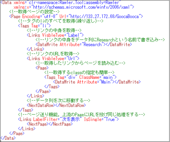 Webサイトスクレイピングのためのプログラミング言語。XMLでデータフローを記述することで、見通しよくWebスクレイピングをおこなうことができる。Webサイトだけでなく、ツイッターからのデータ取得などもできる。また、動的な組み立てもできるので、Urlの入力だけで、Webスクレイピングができたりもする。