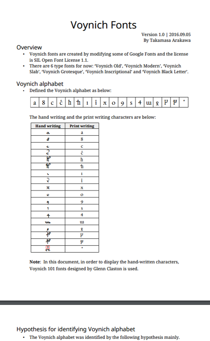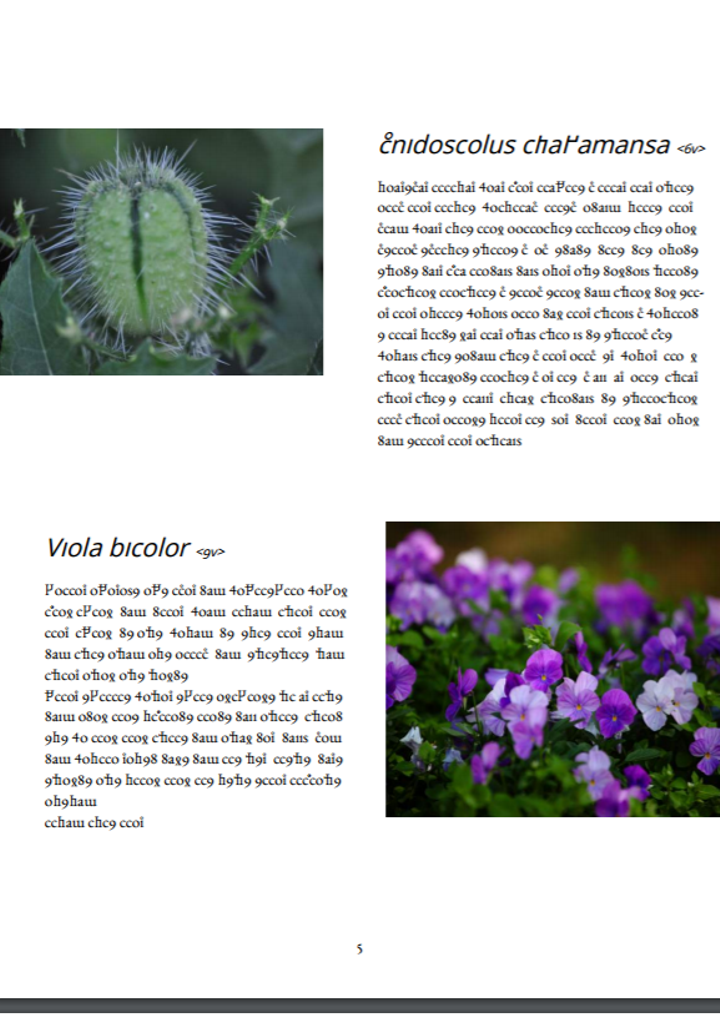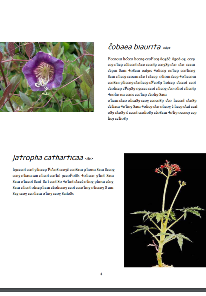 第20回文化庁メディア芸術祭に応募したアート作品 --- 本作品は、未解明の古文書「ヴォイニッチ手稿」の一部を、現代版の書物として作り直したものです。 「ヴォイニッチ手稿」は未知の文字で書かれた手書きの文書で、多くのページでは、植物の絵と文章がセットになっています。最近の研究で、文書に描かれている植物の一部が特定され、また、使われている言語の文法が、消滅した古典ナワトル語に近いことがわかりました。この文書は、消滅した言語で書かれた学術書だったのかもしれません。 もし、この言語が現代まで生き残っていたとしたら、手書きの文字はいずれ活字となり、様々な印刷用の書体がつくられたはずです。この思いつきから私は、この言語のために新しいフォントをつくりました。そして古文書の一部をこのフォントで書き起こし、特定された植物の写真とともにまとめました。これらは今となっては読めません。しかし、そこにはきっと文化や知恵が存在しています。現在、約3000の言語が、消滅の危機に瀕しています。言語とともに文化や知恵が失われてしまうことは、我々にとって大きな損害です。この作品を眺めることで、これらの重要性を身近に感じられるかもしれません。