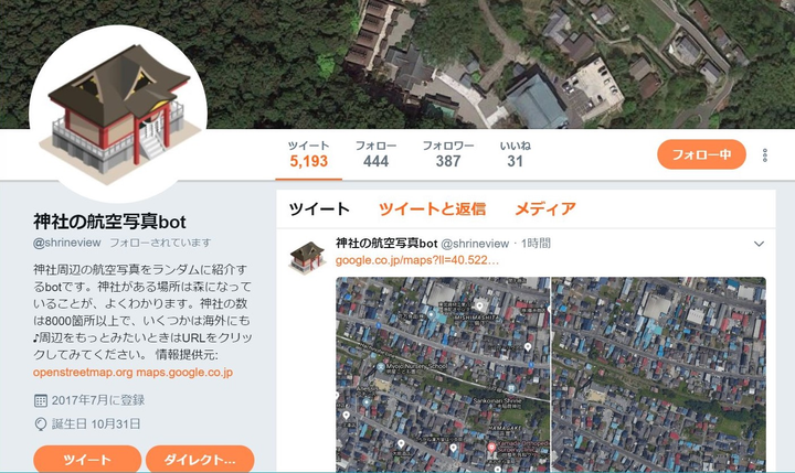 Twitter API の勉強を兼ねて開発した、神社周辺の航空写真をランダムに紹介する Twitter Bot。神社がある場所は昔からの原生林であることが多いのではないか、たくさん集めるとアート作品ができるのではないか、という発想を形にしたもの。神社の位置情報は OpenStreetMap、航空写真は Google マップを利用している。