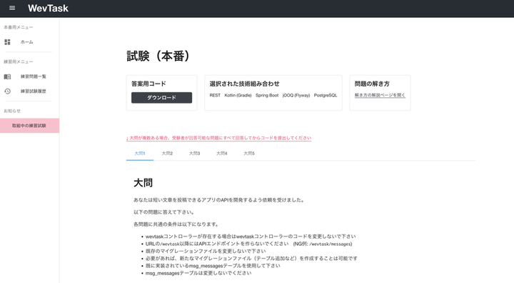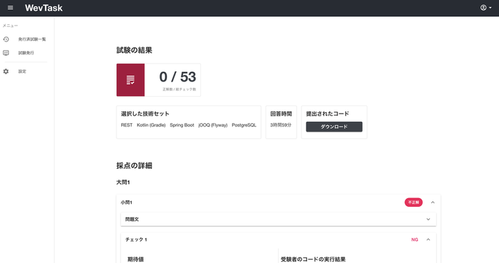 「WevTask」というコーディングテストを提供するSaaSを開発していました。 ■サービス説明動画 https://www.youtube.com/watch?v=Y0bh-U69oOs *添付URLは受験者側目線での使い方を説明した動画です。すでにサービスは閉じています。 ■特徴 【試験発行側】 API形式・言語・フレームワーク・ORマッパー・DBの組み合わせを選択して、試験を発行します。提出された回答は自動で採点され、受験者の書いたコードのダウンロード、テストケースに対する出力を確認できます。 【受験者側】 ローカルで、実際の開発と同様にDB・フレームワーク・マイグレーションを用いてJSON APIを開発する問題を解きます。 ■使用技術 ・フロントエンド:Next.js、TypeScript ・バックエンド:NestJS、TypeScript ・インフラ:AWS、Terraform ・その他:Stripe、Google Identity ■本格リリースしなかった経緯 「競合他社と比較した際の圧倒的強みの欠如」が主な理由です。 詳細は控えますが、見込み顧客の数社にユーザーインタビューを行った際に「競合他社と比較した際の圧倒的強みの欠如」を強く認識しました。 開発開始当初に徹底的に競合分析していれば認識できていたと考えており、私自身の怠惰さが原因の失敗だと考えています。