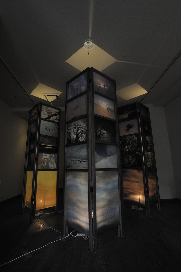東西南北で撮った写真を使い、ネィティブアメリカンのいうヴィジョンクエストをライトタワーで表現したもの 組み合わせで屏風展開もできる