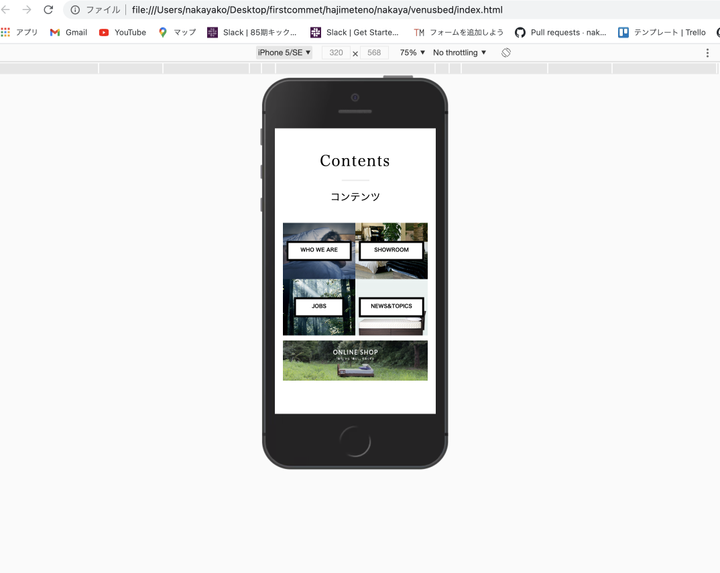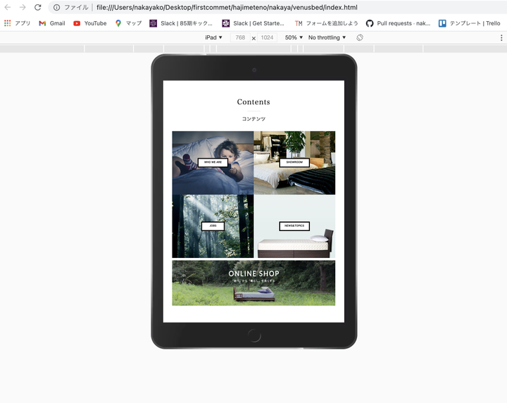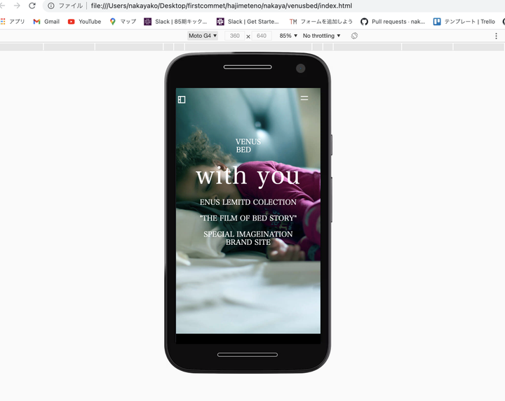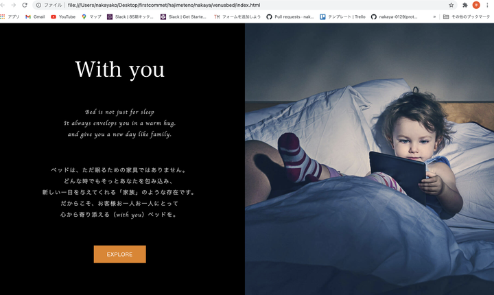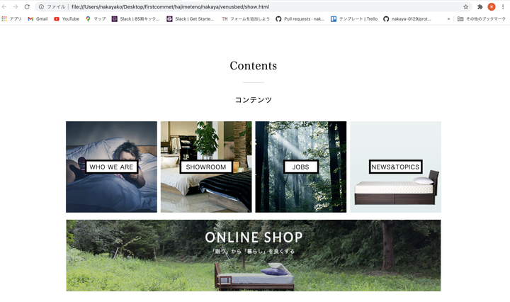 web制作の練習として、venusbedの模写をしています。 レスポンシブの対応まで実装してコーディング力を高めました。 エディターにはVimを使用しています。