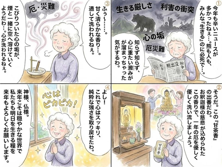 激動の時代、せめて心だけは清らかに。「甘茶香」で洗い流す一年の厄災難。 私たちは今、生きること 「家族を守るお母さんへ」「静かに一年を振り返りたい方へ」 私たちは今、生きることの厳しさを突きつけられる日々の中にいます。 山では食べ物を求めて人里へ降りてくる熊たちの姿があり、世界に目を向ければ、土地や資源といった「利害」を巡る争いが絶えません。人間も動物も、ただ「生きていく」という本能と現実の間で、激しく揺れ動いた一年でした。 日々流れてくるニュースに心を痛め、知らず知らずのうちに私たちの心には、言葉にできない「澱(よど)み」や「心の垢」が溜まっているのではないでしょうか。 お釈迦様のお誕生を祝う「甘茶」の慈悲を、香りに託して。 漫画の中で、おばあちゃんが手に取ったのは**「甘茶香(あまちゃこう)」**。 古来、お釈迦様の誕生を祝う「花まつり」で、その御体に甘茶を注ぎ清める風習があります。その慈悲深い甘茶の香りを練り込んだお香は、私たちの心にこびりついた一年の厄や災難を、優しく洗い流してくれます。 生きるための争いや、利害に疲れた心に。 自然との共生に悩み、不安を抱えた日々に。 来年こそは、穏やかな世界であるように。 「ふぅ〜……」と一息。心の中まで洗われる時間。 甘く清らかな香りが立ち上ると、不思議と肩の力が抜けていきます。 黒い雲のように垂れ込めていた「厄・災難」という文字が、煙とともに空へ消えていく。その瞬間、私たちの心は「ピカピカ」に磨かれ、新しい年を迎えるための純粋な強さを取り戻します。 どうぞ、この年末年始は「甘茶香」を焚いてみてください。 神様仏様に、そして自分自身の心に、「来年もよろしくお願いします」と手を合わせる。その静かな時間が、明日を生きる糧となりますように。 厄除開運あまちゃ香のお取り寄せは、 年末年始も営業中の楽天ロジスティクスからどうぞ☆彡 https://a.r10.to/h5Agy5 #お線香 #お香 #年越し #甘茶香 #線香 ◎◎◎◎◎◎◎◎◎◎◎◎◎◎◎◎◎◎◎◎◎◎◎◎ 会社名 淡路梅薫堂株式会社 住 所 兵庫県淡路市江井2845-1 電 話 0799-86-0065 FAX 0799-86-0224 URL https://www.awaji-baikundo.com MAIL awaji-baikundo@iris.eonet.ne.jp 営業時間.9:00〜12:00.13:00〜16:00. 定休日.年末年始、祝祭日、盆、日曜日、第二・第四土曜日。 淡路梅薫堂公式 FB(フェイスブック) https://facebook.com/AwajiBaikundou/ IG(インスタグラム) https://instagram.com/awajibaikundou/ X(ツイッター) https://x.com/awajibaikundou TikTok https://tiktok.com/@awajibaikundou LINEビジネス https://page.line.me/sbn3753t Pinterest https://pinterest.jp/AwajiBaikundou You Tube https://youtube.com/@shikinohana?si=BTs1agI4UzpFB5DY https://www.amazon.co.jp/淡路梅薫堂-線香%20贈り物-お線香贈答用-お線香%20ギフト-線香ギフト/dp/B07BYSL6L1 https://www.amazon.co.jp/淡路梅薫堂-線香%20贈り物-お線香贈答用-お線香%20ギフト-線香ギフト/dp/B00CQUCHCQ https://www.amazon.co.jp/淡路梅薫堂-お線香-線香-線香%20自宅用-お香/dp/B019UQ768S