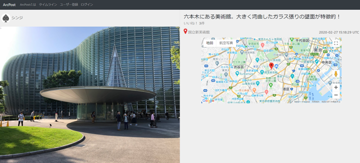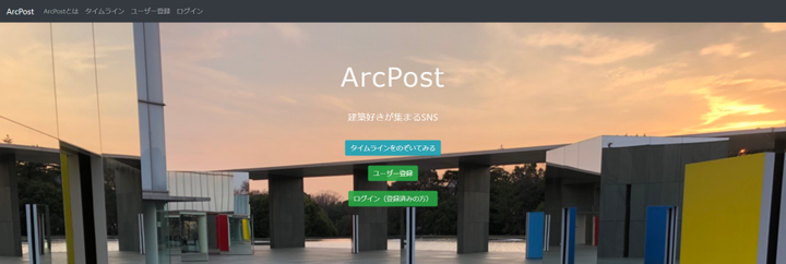 Ruby on Railsで作成した建築写真に特化した画像共有アプリです。 建築好きな方がお気に入りの写真や場所を共有することを目的としています。 行きたいと思った時にすぐに場所が分かるよう、投稿詳細ページでGoogle Mapが表示されるようにしました。 ・アプリケーションの機能 写真投稿機能 ユーザー認証機能 いいね機能 スポット名からGoogle Mapを自動表示 ・使用している技術 Ruby on Rails 5.2.4.1 heroku PostgreSQL geocoder (gem) Google Maps API