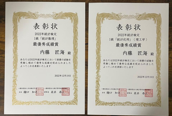 統計検定一級で最優秀成績賞をいただきました