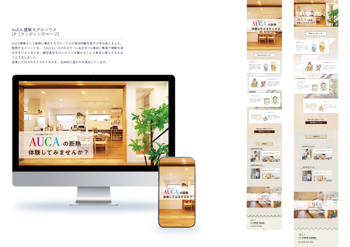 AUCA建築という断熱に優れたモデルハウスの宿泊体験を促すLPを作成しました。 断熱するメリットを、「AUCA」ロゴのカラーにあわせて4項目に簡潔で理解を深めやすいようまとめ、顔写真付きのレビューを載せることで身近に感じてもらおうと工夫しました。 背景にクロスのテクスチャをひき、全体的に温かみを演出しています。