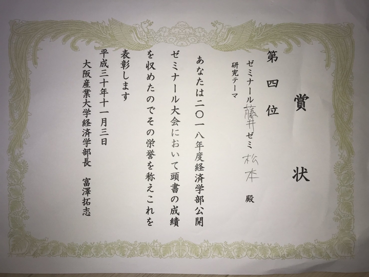 大阪産業大学 経済学部 公開ゼミナール 表彰状