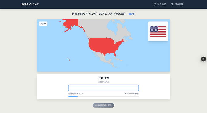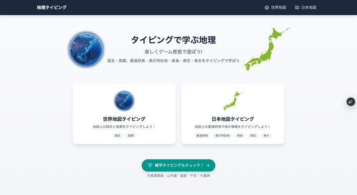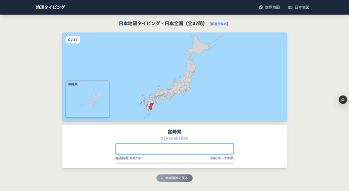 個人開発で地理タイピングゲームを開発しました。 Next.js・TypeScript・TailwindCSSで作成しました。