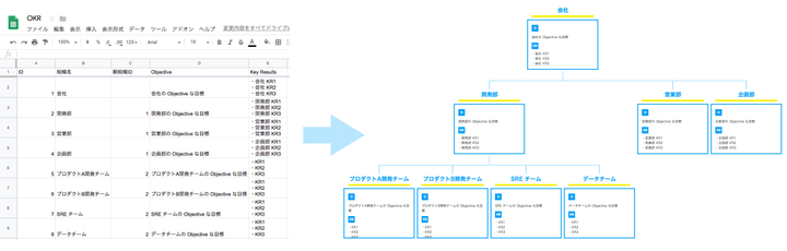 スプレッドシートに OKR の目標を書くと、社内に閉じて Web でツリー表示されるツールを Google Apps Script で作りました。