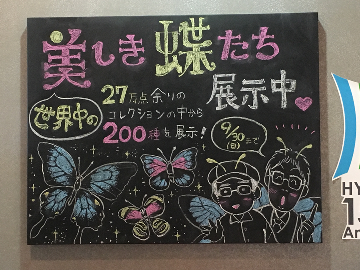 博物館入口に設置している黒板に、チョークで展示案内を描いていました。