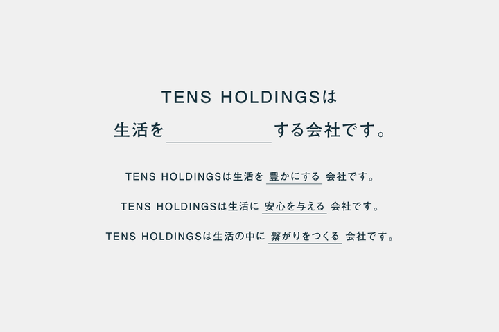東京の府中を拠点として不動産・建設全般におけるビジネススキーム構築、及びコンサルティング業を主軸とした事業をワンストップで展開する株式会社TENSホールディングス。グループ会社を含めた4つのロゴ、Webサイトのデザインを担当させていただきました。今後は飲食や美容といった業種も視野に入れているという会社から、業種を、「豊かにする」会社・「安心を与える」会社・「繋がりをつくる」会社の3つの方向性にわけ、そこにそれぞれエレメントを設定しました。会社(事業)名+エレメントという考え方からロゴのデザインを展開させていくことで、単体で見たときにでもグループ全体を想起できるような、CIのシステムを開発しています。 CL:株式会社TENSホールディングス CD:遠藤 直人(株式会社ストレイト) AD+D:TARROWS CO:森 健太 PH:土田 凌