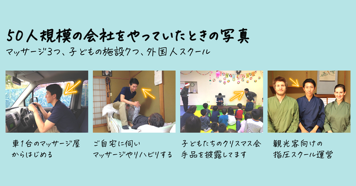 マッサージ屋3つ、子どもの施設を7事業所、外国人指圧スクール運営を経営していました。