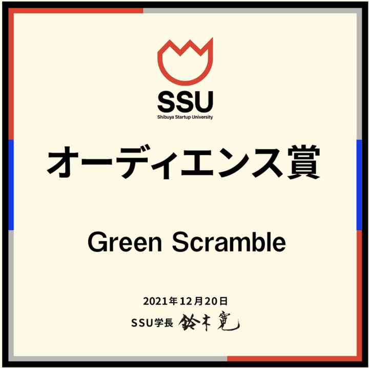 渋谷区のゴミ問題を解決すべく、歩行者が気軽にゴミをすてれるゴミ箱のサービスを立案しました。街を汚しているポイ捨てされた”ゴミ”が、”コミ”ュニケーションのきっかけになると面白いと考え、ゴミ箱の持ち主と捨てた人をアプリ上で繋げるような施策を合わせて立案。渋谷区が綺麗になると同時に、人のつながりを構築するプラットフォームです。 12月にオンラインで公開開催された最終ピッチにて、サイバーエージェントキャピタル様からの企業賞とオーディエンスの投票によるオーディエンス賞をいただきました。