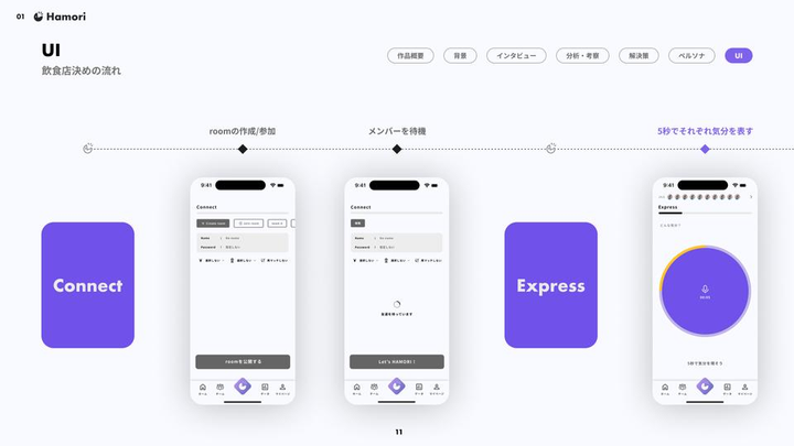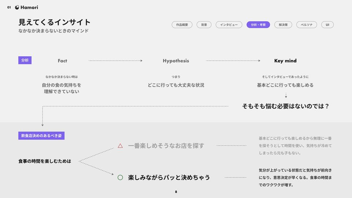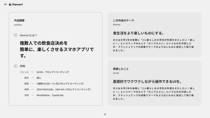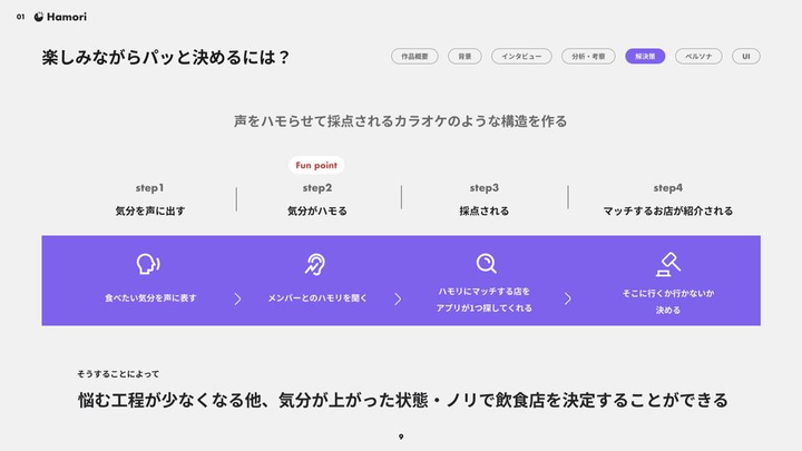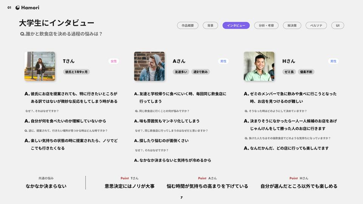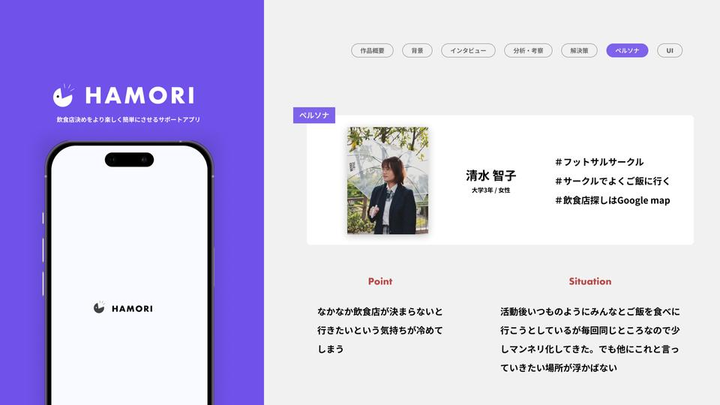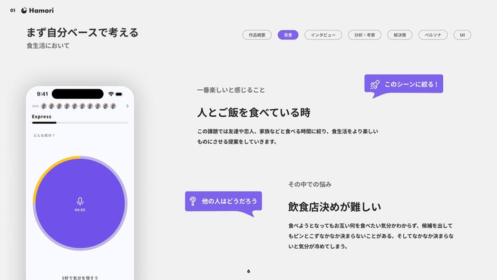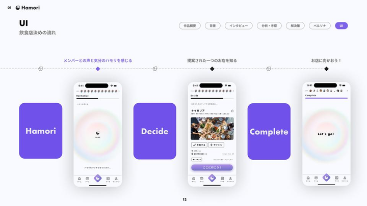 大学生の、「食べに行きたいけどなかなかいい飲食店が見つからない」「そもそも何を食べたい気分かわからない」「遠慮して自分の行きたいところ・食べたいものが言えない」などといった飲食店を決める際の悩みを解決させるアプリです。 個人制作、1週間、Figma